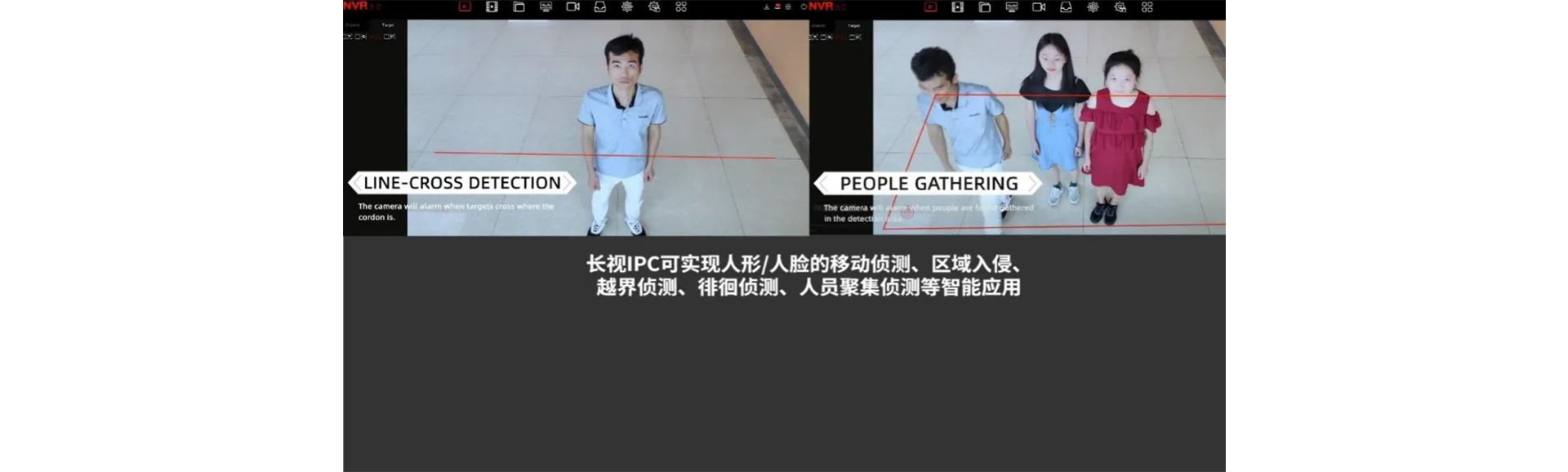 包括基于人形/人臉的移動偵測、區(qū)域入侵、越界偵測、徘徊偵測、人員聚集偵測等,